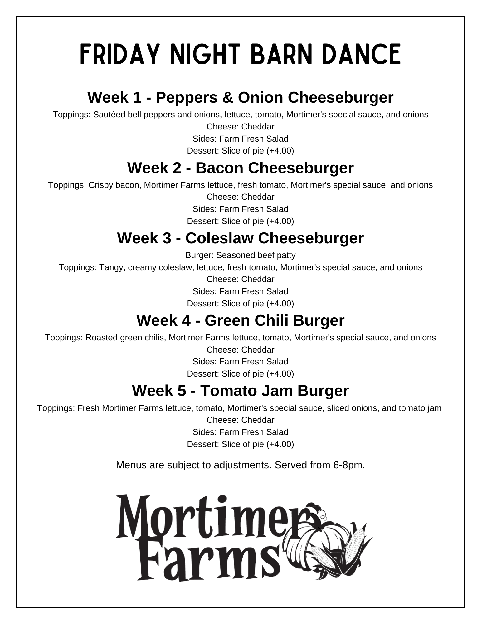 Friday Night Barn Dance at Mortimer Farms is a standing tradition—an evening where the pace slows, music fills the air, and people gather the way they used to: around food, under the sky, on a real working farm.