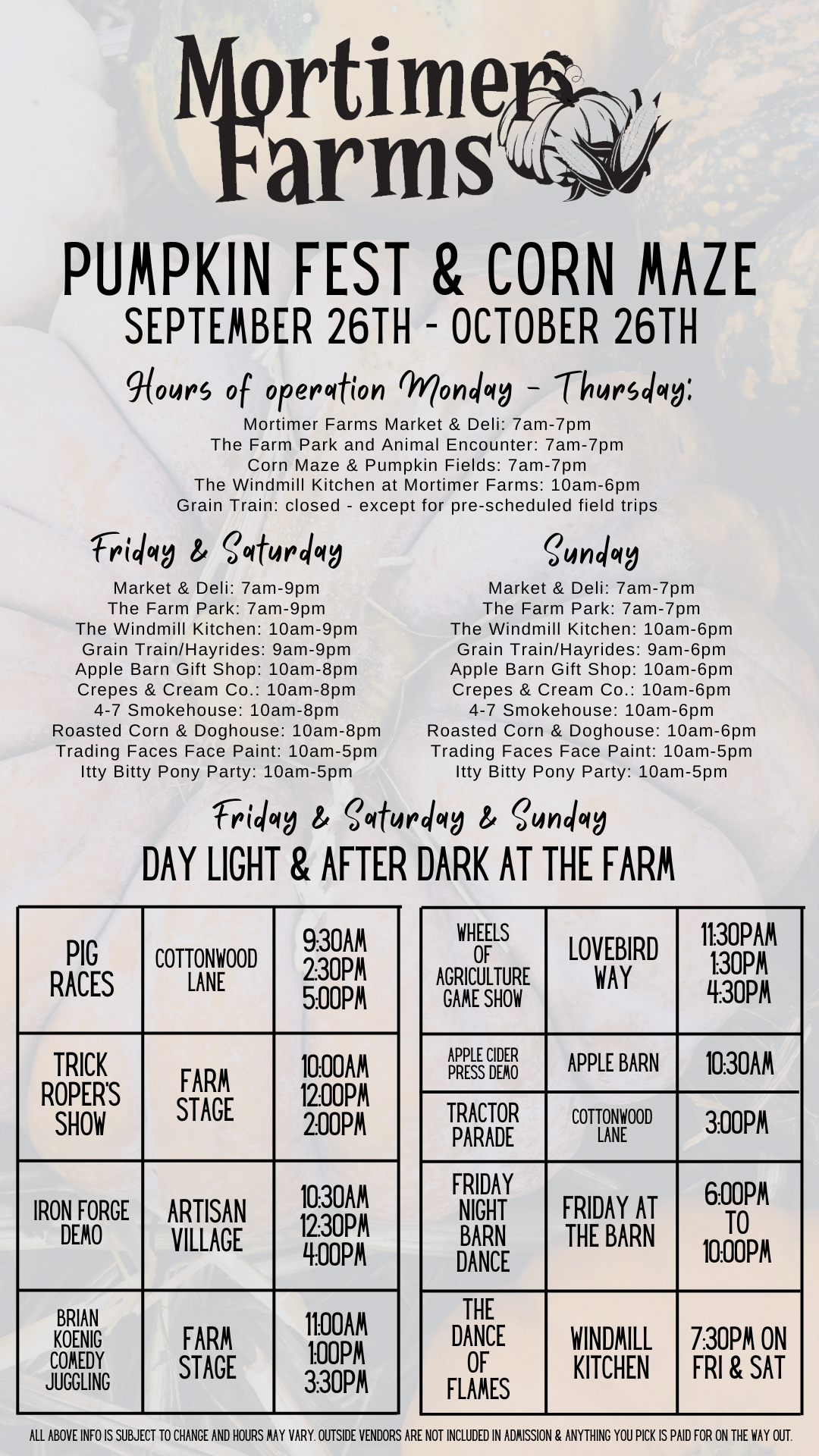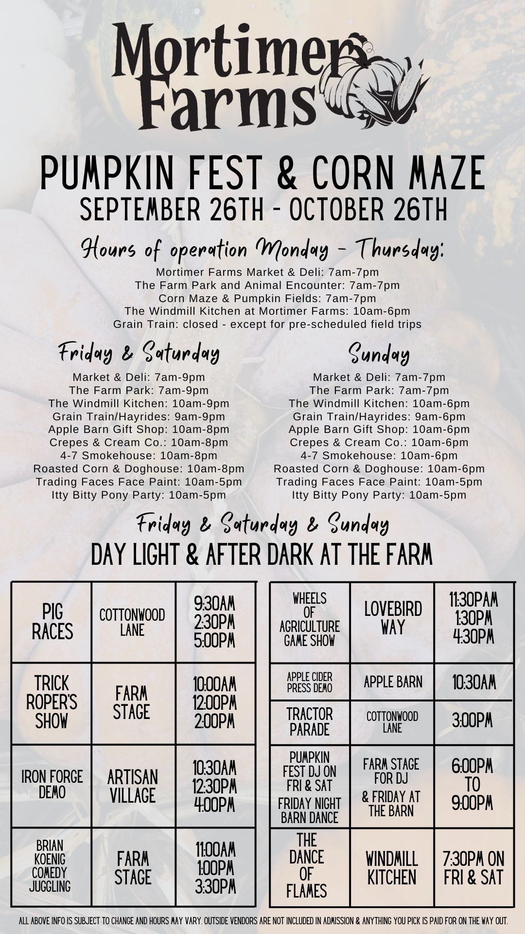 From Monday to Thursday, embrace the thrill of farm-inspired rides, games, activities, the corn maze, pumpkin patch, animal encounters, and more. Please note that hayrides, grain train rides, outside vendors, and shows won't be available on these days.